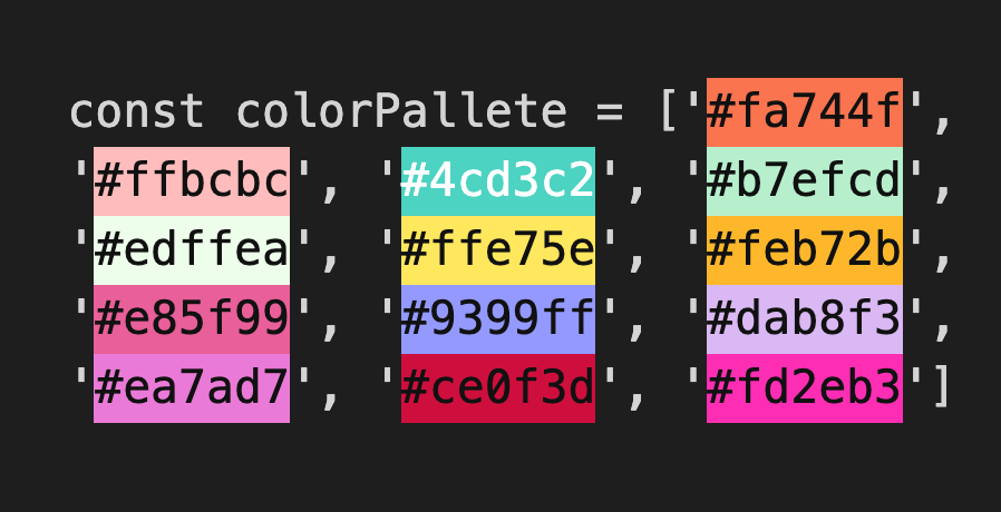 Now, to move into the realm of randomness, we must first start with out set of colors. I chose the these for a mix of bright and pastel ✨vibes✨. I highly recommend a color highlighting plugin for whatever code editor you’re using so that you can visualize and adjust colors right where your code lives.