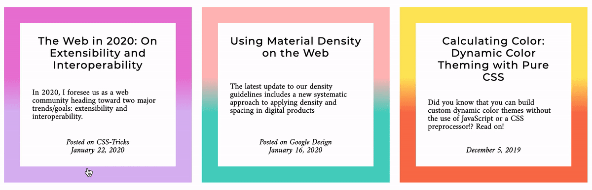 Finally, we’ll need to update those CSS custom properties on the .post itself. To set a property on an inline element you can do: <Element>.style.setProperty('--varName', <VarValue>). This will enable us to eventually run a loop over each .post item and apply unique colors. All together it looks like: