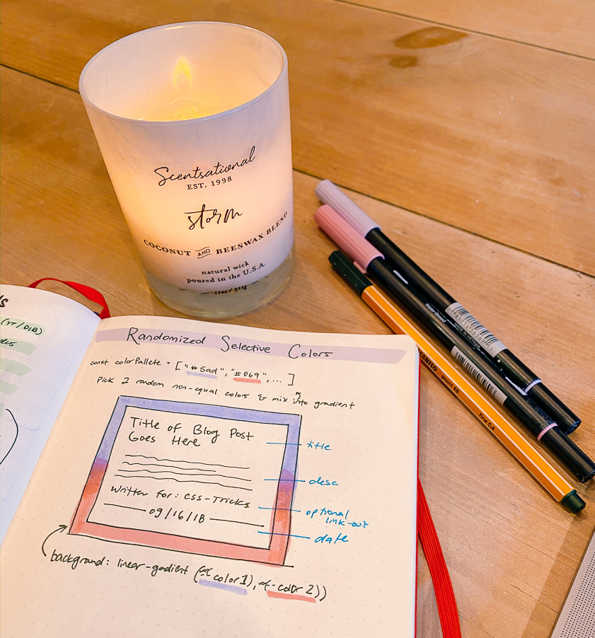 So as a CSS nerd, I was interested in recreating this gradient, and giving it a randomized color. But as a design nerd, I’m also well aware of the dangers of truly random color pairings. So, to get the best of both worlds (whimsy and delight from color combinations + fewer decisions to make and a beautiful set out outcomes), I decided to seed an initial theme palette from which to stay within.