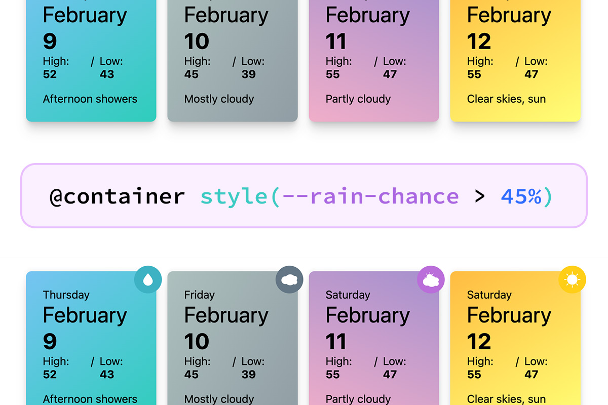 In a real-world scenario, you might be using props for this, and you can leverage those props as well using new capabilities for the attr() function. In this case, we will be casting the [data-rain-percent] attribute into the CSS custom property --rain-percent as a percentage type so that we can use it in the range query.
