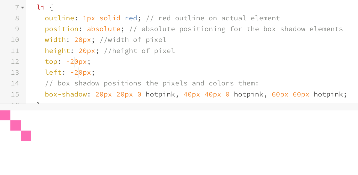 So let’s get started. What exactly is making those little pixels? If the title didn’t give it away, it’s the CSS3 multiple box shadow property. Each pixel is it’s own, individually placed box shadow. These are strung together via a comma-separated list. You can have as many box-shadows as you want on a div. Pretty cool.