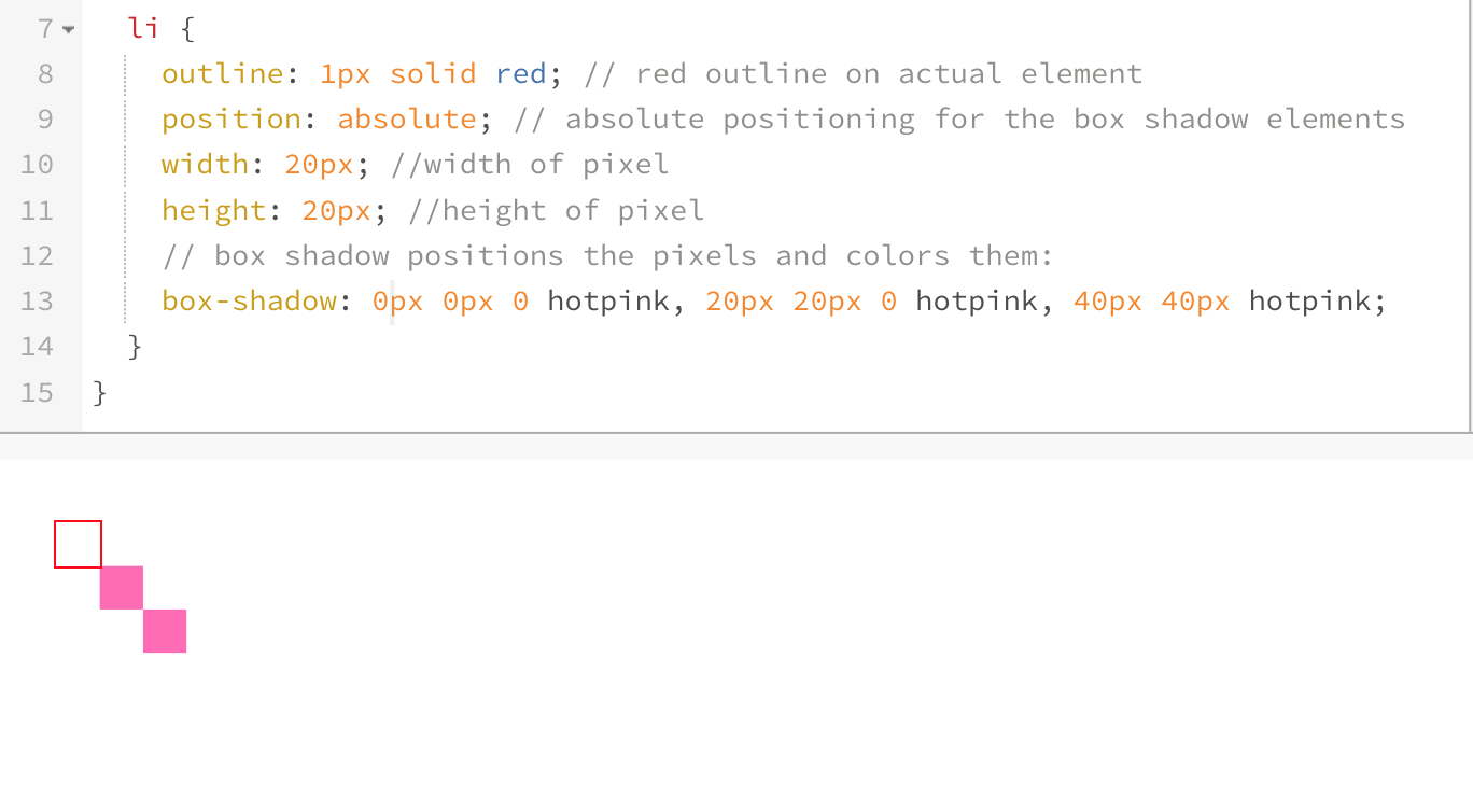 Your box shadow will always be behind your element, so you’ll need to start positioning it at ($pixel-size, $pixel-size) rather than (0,0). Here is a visual example, where our actual div is outlined in red and our box shadows are a hotpink box: