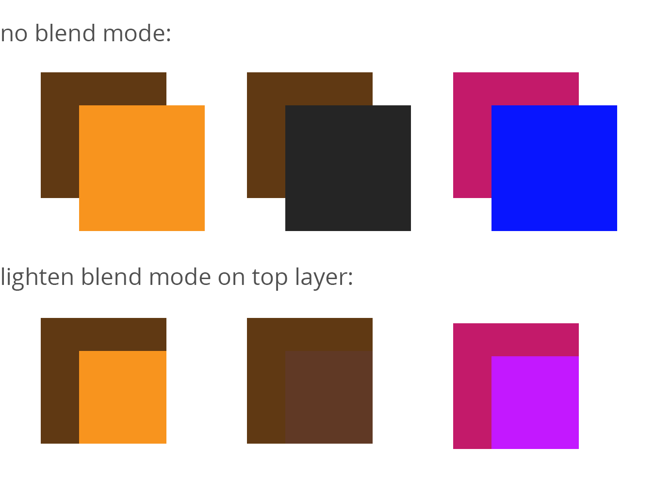 We apply the lighten blend mode to either an overlapping element or a pseudo element. You can use background-blend-mode: lighten on an element with multiple blend modes, or mix-blend-mode: lighten on the overlapping element. However, I’d recommend multiple backgrounds for this (see Application section).